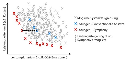 Die Pareto-Fronten bestehen aus acht spezifischen Lösungen, die das Kosten-Optimum bis hin zum CO2-Optimum und den Lösungen dazwischen darstellen. Aufgrund des ändernden Energiebedarfs verschiebt sich die Pareto-Front nach rechts oben, d. h. die Lösungen mit gleicher CO2-Emission werden teurer, vor allem wegen des Bevölkerungswachstums und des zunehmenden Kühlenergiebedarfs.