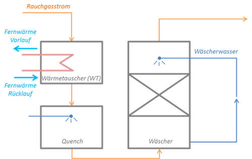 Die KVA und die HKW verfügen über Wäscher, in denen die Rauchgase unter Zugabe von Wasser in mehreren Stufen gewaschen werden. In einer ersten Stufe, der Quench, werden die Rauchgase mit Wasser schlagartig abgekühlt. Dabei wird so viel Wasser verdampft, bis das Gas mit Wasser gesättigt ist. Es stellt sich eine Temperatur von ca. 65 °C ein. Darauffolgend wird das gesättigte Rauchgas in Füllkörperstufen weiter gereinigt. Die Verdampfungsenergie, die dem Rauchgas entzogen wurde, konnte bisher nicht weiter genutzt werden.