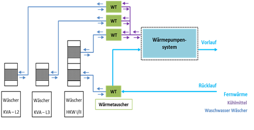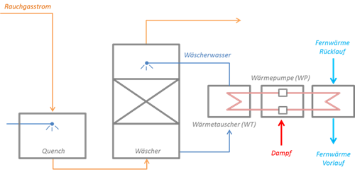 Als optimale Lösung zur Nutzung der Kondensationsenergie hat sich eine Kombination von Direktkondensation und Kondensation mit einer Absorptionswärmepumpe ergeben. Die beiden KVA-Wäscher werden um eine zusätzliche Füllkörperstufe erweitert. Die Abgase werden in der Quench mit Wasser gesättigt und treten mit ca. 65 °C von unten in den Waschturm ein. In der bestehenden Füllkörperstufe (Stufe 1) wird die Wärme durch Direktkondensation (DK) aus dem Rauchgas gewonnen. In einer zusätzlichen Füllkörperstufe (Stufe 2) werden die Rauchgase weiter heruntergekühlt und die freiwerdende Wärme mithilfe einer Wärmepumpe (WP) zur Aufwärmung des FW-Wassers genutzt.