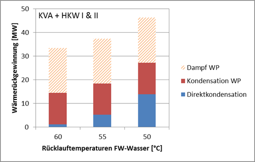 Bei einer Rücklauftemperatur von 50 °C beträgt der Netto-Wärmegewinn 27,2 MW. Zusammen mit dem Treibdampf werden total 46,2 MW in die Erwärmung von FW-Wasser übertragen.