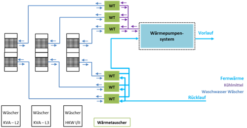 Aktuell betreibt die IWB das FW-System mit einer Vorlauftemperatur von 170 °C. Mit dem FW-Wasser werden Industrie und Haushalte mit Wärme versorgt. Je nach kundenseitigem Wärmebedarf fliesst das FW-Wasser mit unterschiedlichen Rücklauftemperaturen zurück zur KVA. Ein entscheidender Aspekt für die technische Machbarkeit und Rentabilität der Wärmerückgewinnung aus den Rauchgasen ist die Höhe der Rücklauftemperatur des FW-Wassers. Je niedriger die Rücklauftemperatur des FW-Wassers, desto einfacher ist die Wärmerückgewinnung. Um die Abwärme der KVA und der Holzheizkraftwerke besser nutzen zu können, wurde ein Konzept entwickelt, um die Vor- und vor allem die Rücklauftemperatur absenken zu können.