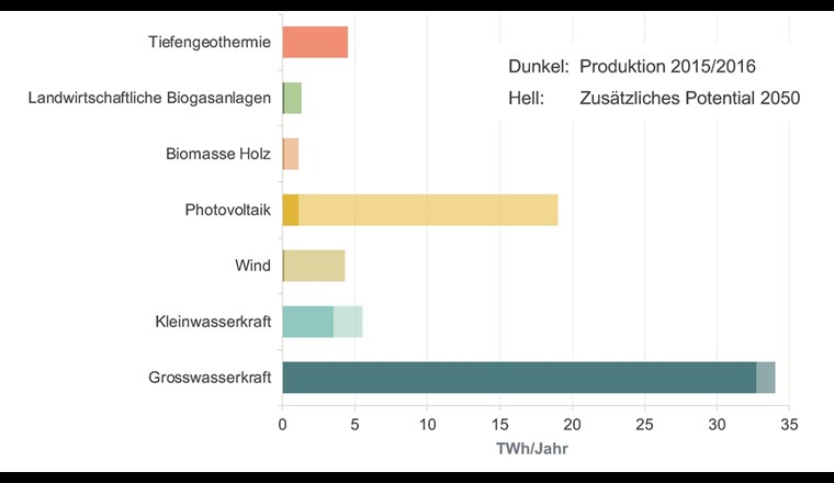 Ein möglicher Pfad hin zu einer klimaneutralen Schweiz wäre eine nahezu vollständige Elektrifizierung des Energiesystems, in dem Strom ausschliesslich aus erneuerbaren Energiequellen erzeugt wird und Endverbraucher primär elektrische Endanwendungen wie elektrische Wärmepumpen und Elektroautos nutzen würden. Gegenwärtig werden unter 25% der Endenergienachfrage von Strom gedeckt, was einem Stromverbrauch von knapp 58 TWh jährlich entspricht. Die übrigen 75% des Endenergieverbrauchs zu elektrifizieren, würde zu einem enormen zusätzlichen Strombedarf führen, selbst unter der Annahme von verbesserten Energieeffizienzen. Durch den beschlossenen Kernenergieausstieg der Schweiz (Bewilligungsverbot neuer Kernkraftwerke) wird der Bedarf an zusätzlichen Stromerzeugungskapazitäten noch weiter steigen, wenn die jährlich etwa 20 TWh Strom aus den vier Schweizer Kernenergiereaktoren ersetzt werden müssen. Diesen Mehrbedarf alleine durch den Ausbau der einheimischen regenerativen Stromerzeugung zu befriedigen, dürfte aus heutiger Sicht ausgeschlossen sein. Zwar beträgt der Anteil erneuerbarer Energien am Schweizer Stromverbrauch bereits heute über 60% (was ungefähr 40 TWh entspricht). Ein Grossteil davon wird jedoch von Grosswasserkraftwerken produziert, deren Zubaupotenzial nahezu ausgeschöpft ist. Der Anteil des Stroms, der aus Biomasse-, Solar- und Windenergie stammt, beträgt derzeit ca. 5%. Aufgrund der schwierigen geografischen Gegebenheiten in der Schweiz ist das zusätzliche Potenzial auch dieser Energien sehr begrenzt. Es wird geschätzt, dass im Jahr 2050, zusätzlich zu den heutigen knapp 40 TWh regenerativen Stroms, insgesamt weitere 32 TWh produziert werden könnten, Wasserkraft eingeschlossen [2]. Etwa die Hälfte des zusätzlichen Ausbaupotenzials entfällt dabei auf die Photovoltaik (PV).