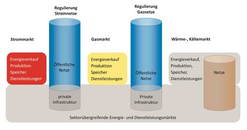 Die Marktordnung und Regulierung der Energieträger orientiert sich heute am Siloprinzip. Gas, Strom und Fernwärme unterliegen zum aktuellen Zeitpunkt in der Schweiz unterschiedlichen Regeln für die Marktleistungen wie Energieverkauf, Produktion und Speicher. Bei den Energieträgern Strom und Gas unterliegen die Netze in der Schweiz einer Zugangsregulierung (Strom) bzw. es ist eine geplant (Gas). Die Strom- und Gaslieferung ist bzw. wird von den öffentlichen Netzen losgelöst mit dem Ziel, Wettbewerb zwischen Strom- und unter Gaslieferanten zu ermöglichen. Ein Aufbrechen der Wertschöpfung im Bereich Wärme und Kälte gibt es bis jetzt in der Schweiz nicht. Im Strom- und Gasbereich unterliegen öffentliche und private Infrastrukturen (z. B. Arealnetze) unterschiedlichen Regeln. Multienergiesysteme verbinden die Energieträger und beanspruchen öffentliche und private Infrastrukturen. Regulierung der Energieträger gemäss Siloprinzip und die Art der Differenzierung der Regulierung und Abgrenzung öffentlicher und privater Infrastrukturen sind mit Blick auf die Weiterentwicklung in Richtung Multienergiesysteme zu überdenken.