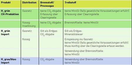 Wasserstoff aus nicht erneuerbarer Produktion, sogenannter grauer und blauer Wasserstoff, fällt unter die Treibstoff-Definition von Art. 2 Abs. 2 des Mineralölsteuergesetzes (MinöStG). Grüner Wasserstoff ist gemäss MinöStG Art. 2 Abs. 3 ein biogener Treibstoff. Erfüllt er gewisse Bedingungen, ist er von der Mineralölsteuer befreit. Diese Befreiung gilt noch bis Ende 2023.