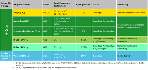 Im Gegensatz zur bestehenden G18 erlaubt die revidierte Richtlinie verschiedene Gasbeschaffenheiten, und zwar methanreiche und wasserstoffreiche Gase. Sie enthält neu neben angepassten Grenzwerten für Gase aus der 2. Gasfamilie «Methanreiche Gase» (H-Gas) ebenfalls Rahmenbedingungen für die Gasfamilie «Wasserstoff»: