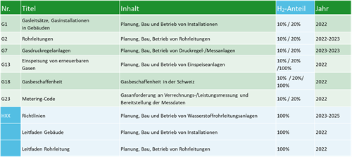 Die Richtlinie G18 ist die Basis für das SVGW-Regelwerk im Bereich Gas, da sie die Beschaffenheit des Gases definiert. Dies bedingt eine Überprüfung und allfällige Revision des SVGW-Regelwerks im Bereich Gas, um Konformität mit erhöhten H2-Gehalten und der neuen Gasfamilie «Wasserstoff» zu gewährleisten. Ein Überblick der zu revidierenden respektive der neu zu schaffenden Regelwerke ist in nachfolgender Tabelle gegeben: