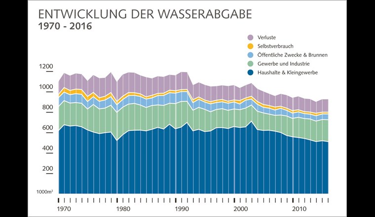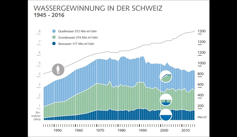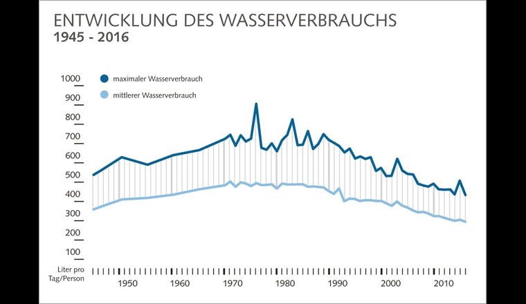 Die Schweizer Wasserversorgungen stellten 2016 923 Mio. m3 Wasser bereit. Das sind gut 1% weniger als im Vorjahr. Der Pro-Kopf-Verbrauch sank von 307 auf 299 Liter pro Tag und liegt nach dem Trockenjahr 2015 nun wieder etwa auf dem Niveau von 2014. Damit setzt sich der rückläufige Verbrauchstrend fort, der in den Achtzigerjahren begann. Das geht aus der soeben fertiggestellten Wasserstatistik des Branchenverbands SVGW hervor. In der Medienmitteilung dazu wird auch auf die dieses Jahr durchgeführte Imageumfrage des Verbandes verwiesen. Diese ergab, dass die Bevölkerung das Schweizer Trinkwasser weiterhin als sehr gut einstuft.