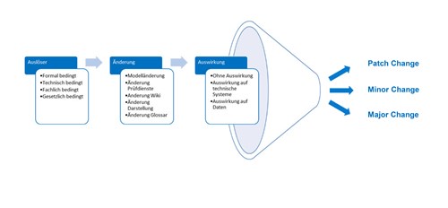 Änderungen an der «Wegleitung Daten der Siedlungsentwässerung» können frei von Auswirkungen sein oder Auswirkungen auf im Zusammenhang stehende technische Systeme wie Schnittstellen, Datenbanken, Prüfmechanismen sowie auf die Daten oder auf nachgelagerte Prozesse haben. Je nachdem, welche und wie viele Auslöser mit welchen Auswirkungen vorliegen, kommen verschiedene Changes zur Anwendung (s. auch Abb. 2):