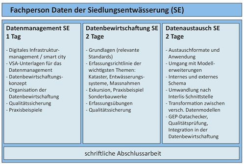 Dieses für jeden GEP-Ingenieur unumgängliche Gesamtpaket wird abgerundet durch die Ausbildungsreihe «Fachperson Daten der Siedlungsentwässerung», welche die Grundlagen des Datenmanagements für die Siedlungsentwässerung und für die GEP-Bearbeitung vermittelt. Die Ausbildung ist entsprechend den unterschiedlichen Aufgaben im Datenmanagement in drei Module unterteilt, die individuell gebucht werden können (s. Abb. 3).