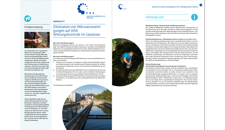 Das Merkblatt zeigt den aktuellen Wissenstand auf und soll Betreibern, Behörden und Beratungsbüros als Entscheidungshilfe im Umgang mit der Wirkungskontrolle im Gewässer vor und nach Ausbau der ARA mit einer vierten Reinigungsstufe dienen.