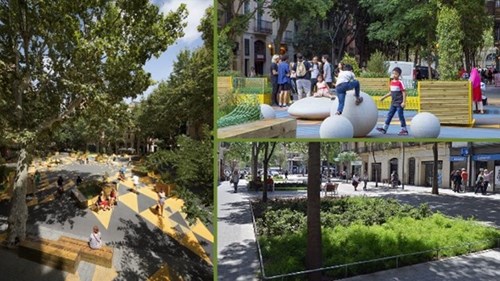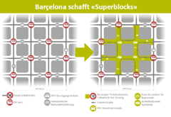 Barcelona zeichnet sich durch wenig Grünfläche pro Einwohner aus. Das will die Stadt ändern. Mit sogenannten Superblocks werden bis zu neun Häuserblocks zusammengefasst. Innerhalb dieser Superblocks haben Fussgänger und Fahrradfahrer Vorrang, Strassen werden wo möglich redimensioniert. Kinder können hier spielen, Anwohner auf neu errichteten Parkbänken Kaffee trinken und plaudern. Bepflanzte Hochbeete, Blumenkübel und Bäumen prägen neu das Bild in diesen Superblocks. Autoverkehr ist auf den verbleibenden Einbahnstrassen nur mit 10 bis 20 km/h erlaubt. Die Folge: Die Strassen werden von Einwohnerinnen und Einwohnern als erweiterte Wohnzimmer genutzt.