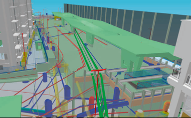 Am Beispielprojekt sind alle Werkleitungen von der Kanalisation bis zur Lüftung der Tiefgarage dreidimensional modelliert. Die zu verlegenden Leitungen der Werke sind mit allen notwendigen Attributen versehen, damit ein reibungsloser Bauablauf stattfindet und alle Mengen ab dem Modell ermittelt werden können.