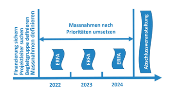 Das Projekt ist auf eine Zeitdauer von drei Jahren ausgelegt. Eine erste Sitzung der konstituierten Begleitgruppe ist für Februar 2022 geplant. Das genaue Terminprogramm wird von der Begleitgruppe festgelegt werden. Als Rahmen sind jährliche ERFA-Veranstaltungen geplant sowie Anfang 2025 eine Abschlussveranstaltung.