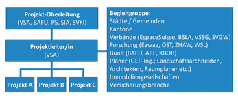 Zusammen mit dem Bundesamt für Umwelt (BAFU), der Präventionsstiftung der Kantonalen Gebäudeversicherungen (PS), dem Schweizerischen Verband kommunale Infrastruktur (SVKI) und dem Schweizerischen Ingenieur- und Architektenverein (SIA) nimmt der VSA die Projektoberleitung und Aufsicht wahr.