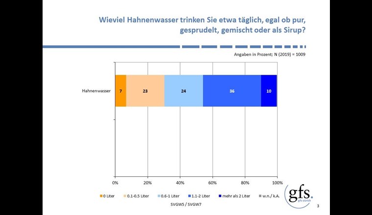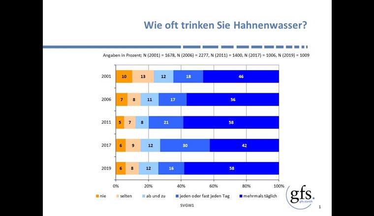 Hahnenwasser geniesst in der Schweiz seit 2001 eine ungebrochen hohe Beliebtheit. Aktuell konsumieren es 58% der Bevölkerung mehrmals täglich, 28% trinken es «jeden oder fast jeden» Tag oder «ab und zu». Frauen trinken Hahnenwasser noch etwas häufiger als Männer. Lediglich 14% geben an, «nie» oder «nur selten» Trinkwasser zu konsumieren, 2001 waren es noch 23%. Als Hauptgründe fürs Hahnenwassertrinken werden der «gute Geschmack» und die «hohe Qualität» sowie der «günstige Preis» und die «hohe Verfügbarkeit» am meisten genannt.
