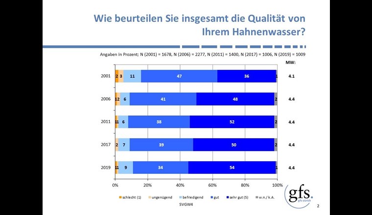 Knapp 90% der Bevölkerung beurteilen ihre Hahnenwasserqualität als «sehr gut» oder «gut». Insbesondere die Beurteilung «sehr gut» hat sich in den letzten 18 Jahren stetig verbessert und wird heute von 54% angegeben. Entsprechend bekundet die Bevölkerung auch grosses Vertrauen in die Wasserversorgungen. 65% haben «sehr viel» Vertrauen, 21% haben «viel» Vertrauen.