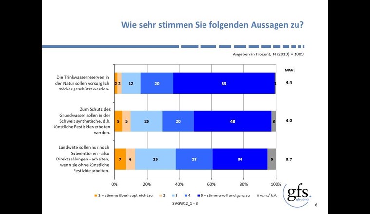 Unverändert hoch ist der Anspruch, ein möglichst natürliches, das heisst ein möglichst wenig aufbereitetes Trinkwasser zur Verfügung zu haben. Für 42% ist dies «sehr wichtig» und für 20% «wichtig». Dementsprechend begrüssen 83%, die Forderung, dass die Trinkwasserressourcen vorsorglich stärker geschützt werden sollen. Auch die Hauptforderungen der beiden hängigen Volksinitiativen geniessen in der Schweizer Bevölkerung Unterstützung. 68% würden zum Schutz des Grundwassers ein Verbot von synthetischen Pestiziden (eher) begrüssen und 57% würden die Forderung, dass nur noch Landwirte finanziell unterstützt werden, die ohne künstliche Pestizide arbeiten, (eher) unterstützen.