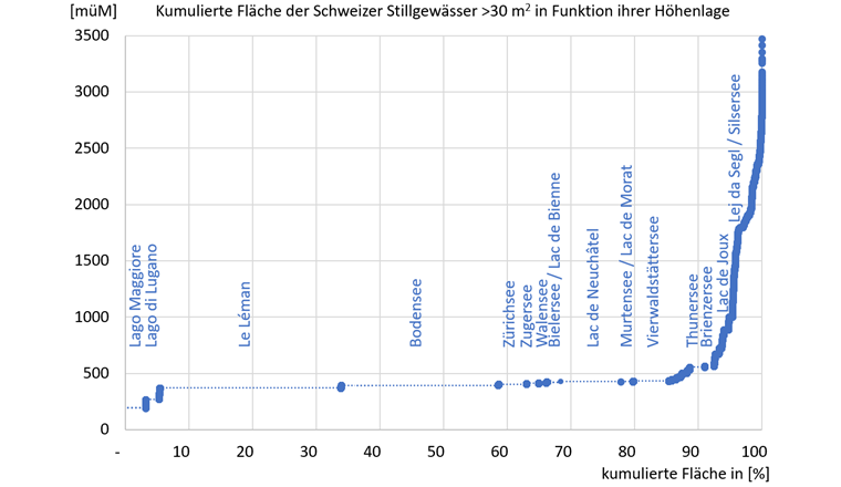 Die Schweiz weist hinsichtlich ihrer biogeografischen, topografischen und limnologischen Ausprägung eine hohe Strukturvielfalt auf. Figur 3 illustriert z. B. den prozentualen Flächenanteil und die Höhenlage der Stillgewässer in der Schweiz. Ihre Anzahl beträgt gemäss Analysen des Landschaftsmodells vector25 (1:25 000) der Swisstopo rund 11 133 Gewässer mit einer Fläche von mehr als 30 m2; gemäss den Analysen des Landschaftsmodells swissTLM3D der Swisstopo sogar 16 683 Gewässer mit einer Fläche grösser als 28 m2. Zu beachten ist, dass in dieser Summe auch Weiher, Teiche und künstliche Stillgewässer enthalten sind.