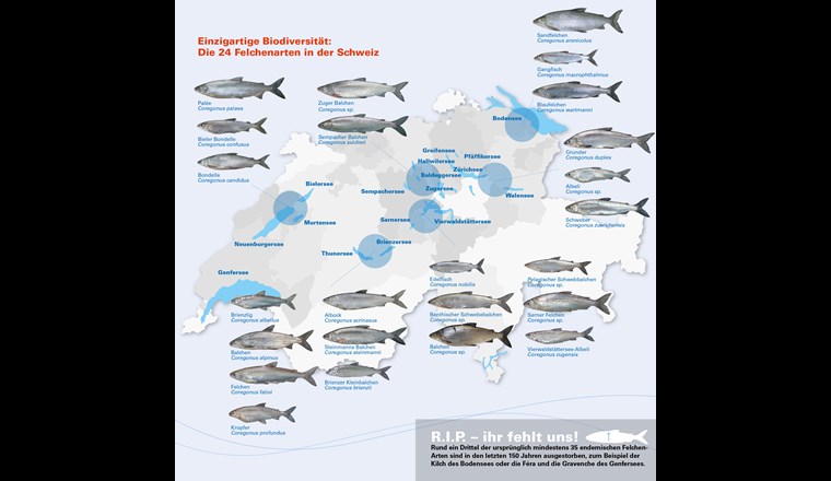 Die wunderbar im Wasser glänzenden silbernen Schwärme der Felchen sind ein wertvoller Schatz Sie entwickeln sich laufend weiter. «Die Felchen sind Botschafter für Artenvielfalt, ja für die ganze Biodiversität» sagt Roberto Zanetti, Zentralpräsident des Schweizerischen Fischerei-Verbandes. Ausgerechnet dieser anpassungsfähige Fisch ist Opfer der sich verschlechternden Lebensbedingungen im Wasser. «Die Zahlen müssen uns zu denken geben.» Aktuell hat es in der Schweiz noch 24 Arten, ein Drittel an Arten ist bereits ausgestorben.
