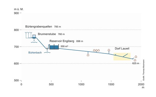 – Die Höhenanordnung von Quellen, Reservoir und Dorf ermöglicht eine Speisung des Reservoirs und die Verteilung im Netz mit Ausnahme eines Hofes ausserhalb des Dorfes ohne Pumpen. Der Energiebedarf für den Betrieb ist gering (s. auch UF-Anlage).