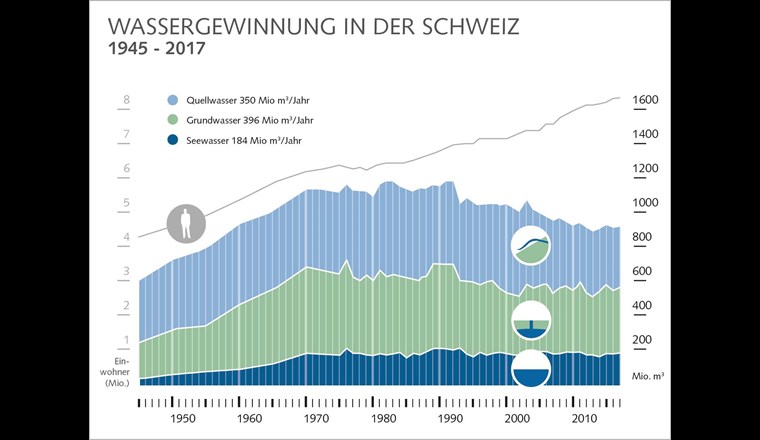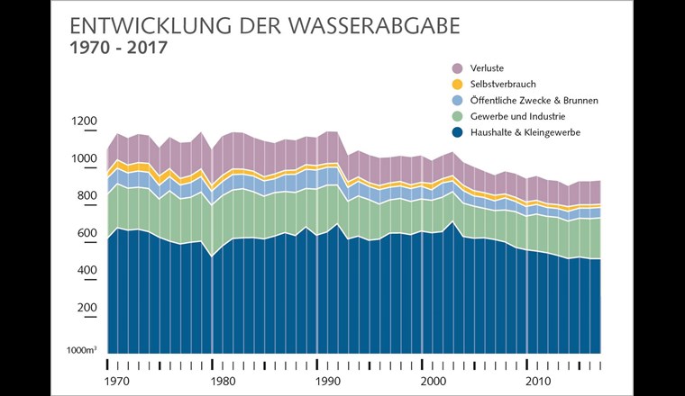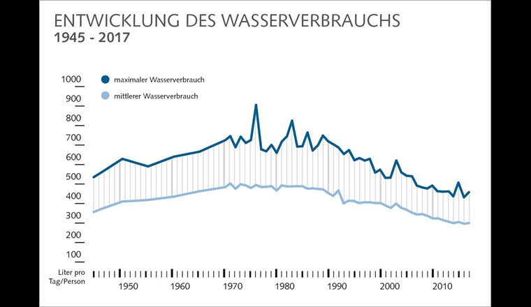 Seit Mitte der 1980-er Jahre ist der Wasserverbrauch – mit Ausnahme der Jahre 1994, 2003, 2006 und 2015 – stetig zurückgegangen und dies trotz steigender Wohnbevölkerung. Die gesamte Wasserabgabe pro Person und Tag war 2017 mit 299,5 Litern gleich wie 2016. Der seit bald 40 Jahren rückläufige Trend beim Trinkwasserverbrauch in der Schweiz hat sich vorerst also nicht fortgesetzt.