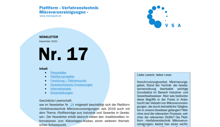 Die Plattform „Verfahrenstechnik Mikroverunreinigungen“ ist eine gemeinsame Initiative von VSA, BAFU und Eawag. Sie erarbeitet seit 2012 Expertenwissen zur Elimination von Mikroverunreinigungen auf den Kläranlagen und beschäftigt sich seit 2019 auch mit dem Thema Stoffeinträge aus Industrie und Gewerbe. Dazu fördert die Plattform den gesamtschweizerischen Wissensaufbau und stellt den fachlichen Austausch zwischen Forschung und Praxis sicher. Die Plattform ist Teil der VSA-Kompetenzzentren «Abwasserreinigung» und «Industrie und Gewerbe».