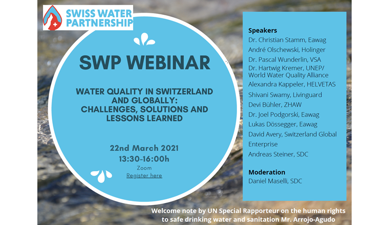 Die Swiss Water Partnership (SWP) will sich im Seminar über Herausforderungen und Lösungen zum Thema Wasserqualität austauschen und eine Brücke von der Situation in der Schweiz zur globalen Situation schlagen. Der Zugang zu sauberem Wasser und der Schutz der natürlichen Ressourcen sind globale Herausforderungen und haben sowohl für die Schweiz als auch international eine hohe Priorität und Relevanz. Daher ist der Weltwassertag eine Gelegenheit, Bewusstsein zu schaffen und Wissen zu diesem Thema zu teilen, das sich auch auf das UN-Wasserthema «Wertschätzung von Wasser» bezieht. Fachleute aus der Schweiz erklären, wie man Wasser erfolgreich schützen und aufbereiten kann. Auch Schweizer Experten, die Projekte rund um den Globus umsetzen, teilen ihre Erfahrung und Wissen.