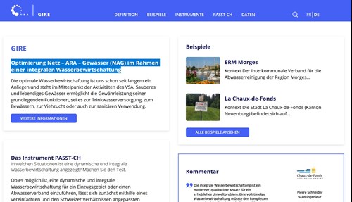 Ziel des Projektes war auch, die gewonnen Erkenntnisse der Branche verfügbar zu machen und Hilfsmittel zu entwickeln, welche künftig eine integrierte Wasserbewirtschaftung erleichtern. Die konkreten Anwendungsbeispiele der Städte Morges (VD), La Chaux-de-Fonds (NE), Lugano (TI), Hochdorf (LU) sowie Steinach (SG) wurden analysiert und ausgewertet und sind nun auf der Website gire.ch in Deutsch und Französisch einsehbar.
