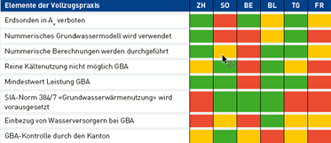 In der Tabelle sind die wichtigsten Elemente der Vollzugspraxis in sechs Kantonen hinsichtlich geothermischer Anlagen und Trinkwassersicherheit zusammengefasst und bewertet. Viele Kantone verbieten das Erstellen von Erdwärmesonden im Gewässerschutzbereich Au aufgrund der damit verbundenen Risiken. Die Kantone Thurgau und Zürich besitzen ein nummerisches Grundwassermodell für ihre grössten Grundwasseraquifere (Limmat und Thur), in welches die Temperaturfahnen von geothermischen Anlagen eingetragen werden können, um Kaskadeneffekte zu verhindern. In diesen Kantonen sowie im Kanton Basel-Landschaft sind nummerische Berechnungen der Temperaturausbreitung einer GBA für die Bewilligung notwendig. Die reine Kältenutzung durch GBA ist in den Kantonen Basel-Landschaft und Solothurn verboten. Da der Bund empfiehlt, möglichst grosse GBA zu erstellen, fordern viele Kantone eine Mindestleistung. Die Wasserversorger werden nur im Kanton ­Basel-Landschaft konsequent und aktiv in den Bewilligungsprozess von geothermischen Anlagen einbezogen. In den Kantonen Zürich, Bern und Solothurn müssen die Bauarbeiten für eine GBA von einem Hydrogeologen begleitet werden, in Solothurn werden die Anlagen danach auch noch vom Kanton abgenommen.